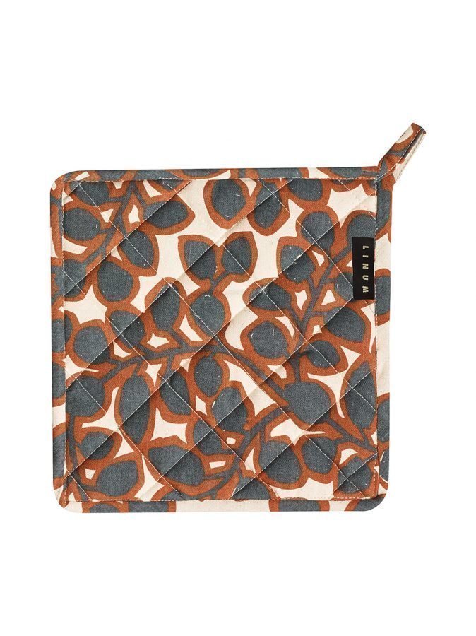 Tikattua ruskeansävyistä patalappua koristaa Mathias Elovssonin suunnittelema eläväinen kuosi. Patalapussa on ripustuslenkki, ja se on valmistettu puuvillakankaasta.
