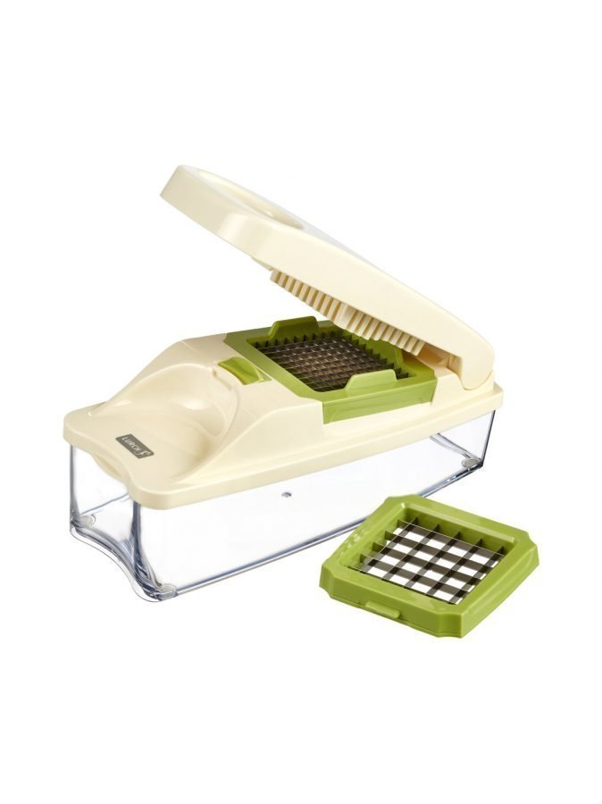 Perunan, porkkanan ja hedelmien pilkkominen on usein työlästä ja viipaleista tulee eri kokoisia. Kätevällä vihannessilppurilla pienit monet kasvikset ja hedelmät kuutioiksi tai tikuiksi nopesti ja helposti. Pakkauksessa on kaksi terävää terää, joilla leikkaat 7 x 7 mm ja 14 x 14 mm kokoisia paloja suoraa alla olevaan säiliöön. Pohjassa olevat liukuesteet pitävät astian paikoillaan.