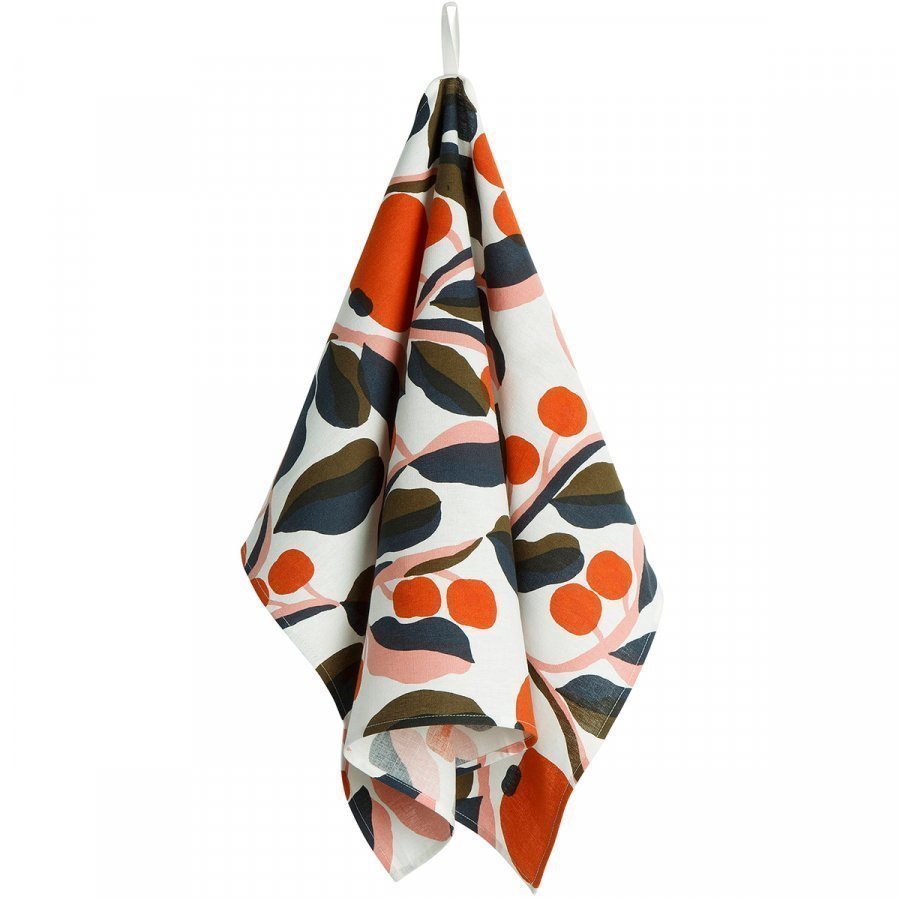 Marimekon Jaspi-keittiöpyyhe on kuvioitu Aino-Maija Metsolan vuonna 2013 suunnittelemalla kuosilla, jota rytmittävät kuulaat syysomenat ja marjat raikkaissa punavalkoisissa sävyissä. Pyyhe on valmistettu korkealaatuisesta puuvillan ja pellavan sekoituksesta.