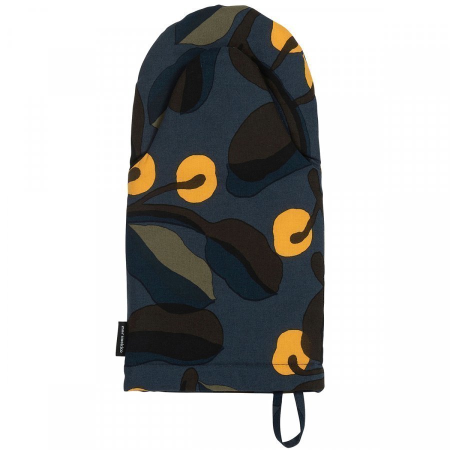 Marimekon Jaspi-uunikinnas on kuvioitu Aino-Maija Metsolan vuonna 2013 suunnittelemalla kuosilla, jota rytmittävät kuulaat syysomenat ja marjat tunnelmallisissa sinikeltaisissa sävyissä. Topatussa uunikintaassa on kätevä ripustuslenkki, ja se sopii sekä oikea- että vasenkätisille ruoanlaittajille.