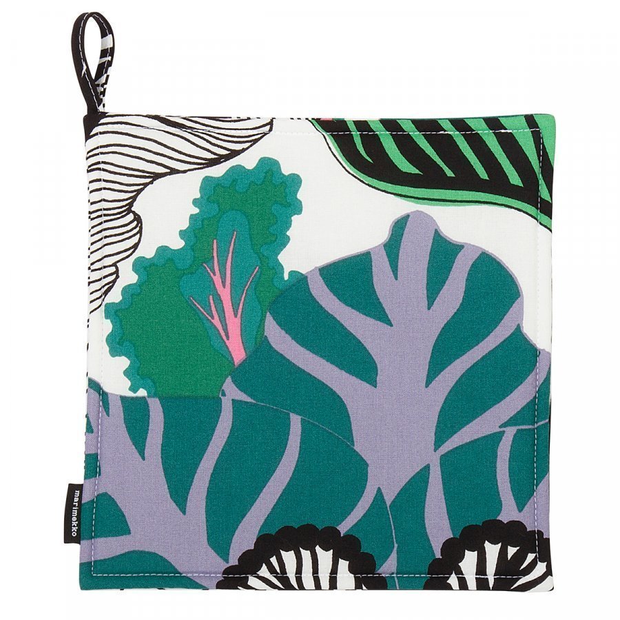 Marimekon Kaalimetsä-pannulappu on kuvioitu kesäisen kaalimaan runsailla muodoilla ja elämäntäyteisillä väreillä, jotka ovat Maija Louekarin käsialaa vuodelta 2017. Topatusta puuvillasta valmistettu patalappu tuo väriä keittiöön ja yhdistyy oivallisesti Kaalimetsä-sarjan muiden keittiötekstiilien kanssa.