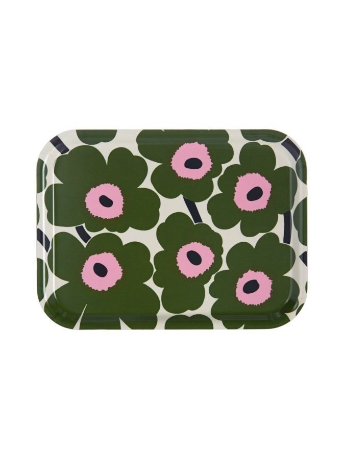 Vaneritarjottimessa on Mini-Unikko-kuosi. Tarjotin on kooltaan 27 x 20 cm.