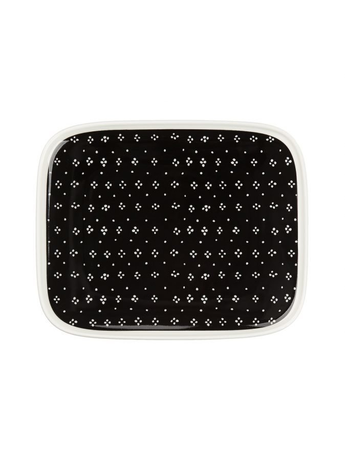 Pientä suorakulmaista lautasta koristaa Maija Isolan suunnittelema Muija-kuosi. Lautanen sopii kattaukseen esimerkiksi leivän tai muun pienen tarjottavan alustaksi.Materiaali on posliinia, joka kestää astianpesukoneen, mikroaaltouunin, uunin sekä pakastimen.