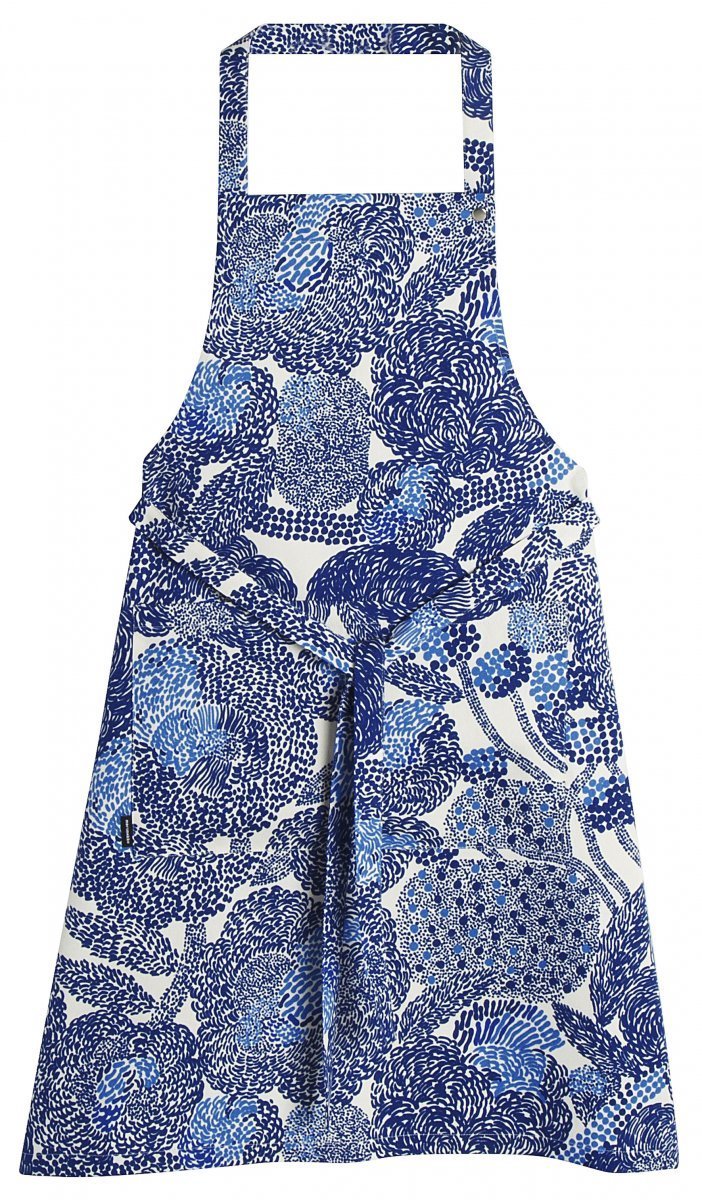 Marimekko Mynsteri -esiliinassa on tasku, säädettävä niskanauha ja solmittavat vyötärönauhat. Sininen-valkoinen. Tilaa!