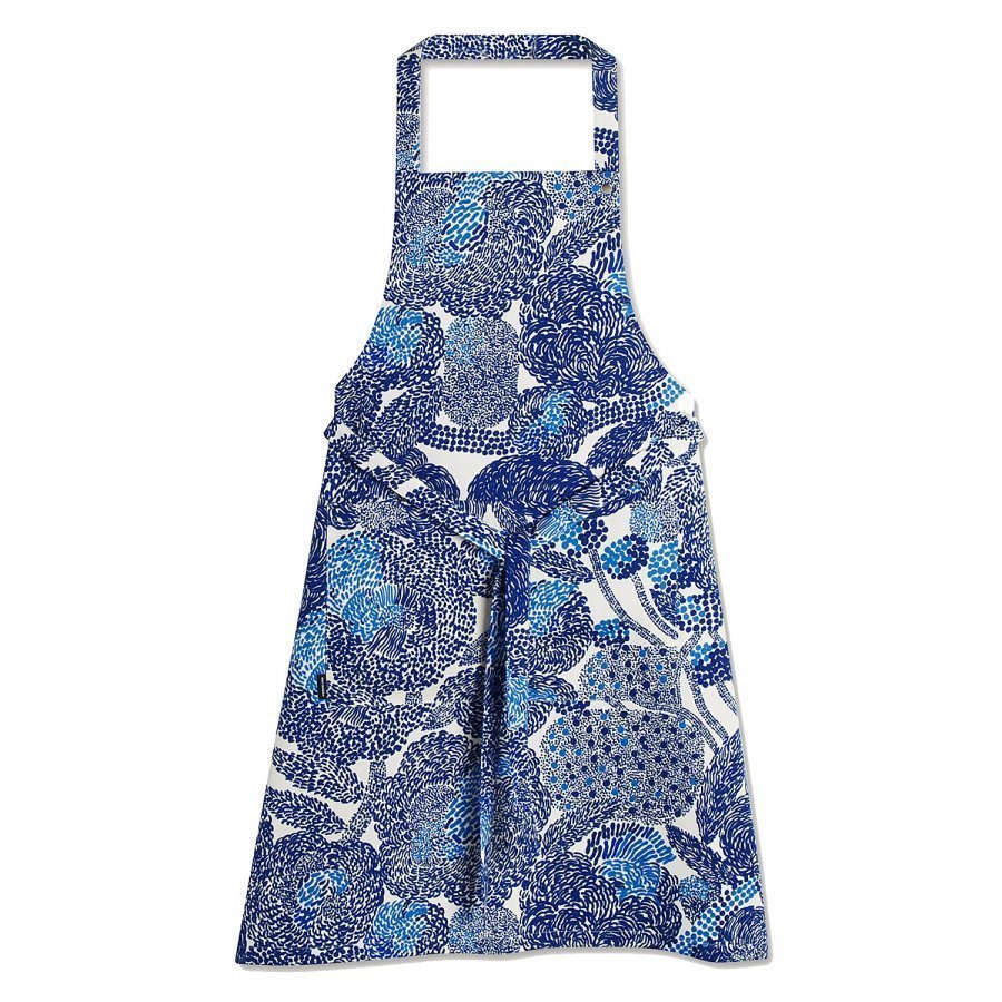 Mynsteri esiliina merkiltä Marimekko. Hieno esiliina kodin mestarikokille. Esiliinassa on koristeellinen nauha, jonka avulla voit helposti kiinnittää sen paikoilleen. Jännittävä ja ainutlaatuinen kuvio sinivalkoisessa sävyissä, tuo lisäpilkahduksen väriä keittiöön. Tämä ei ole esiliina jonka ripustat kaappiin, vaan pidät keittiössä sisustusyksityiskohtana. Mynsteri sarjassa on monia keittiötarvikkeita, joissa on sama malli, joka on erinomainen yhdistää.