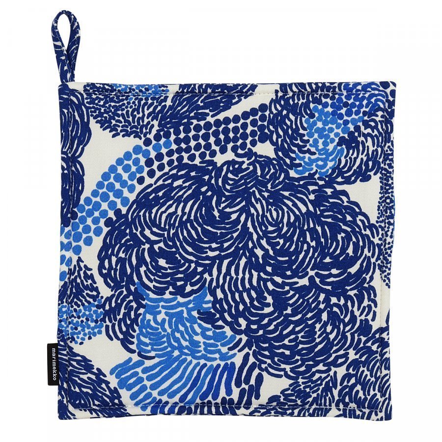 Marimekon Mynsteri-patalapussa kukkii Aino-Maija Metsolan suunnittelema pitsimäisenä rönsyilevä kukkakuosi raikkaissa sinisen ja valkoisen sävyissä. Patalappu on valmistettu paksusta puuvillasta ja sen kulmassa on kätevä ripustuslenkki. Neliönmuotoisen pannulapun koko on 21,5 x 21,5 cm.