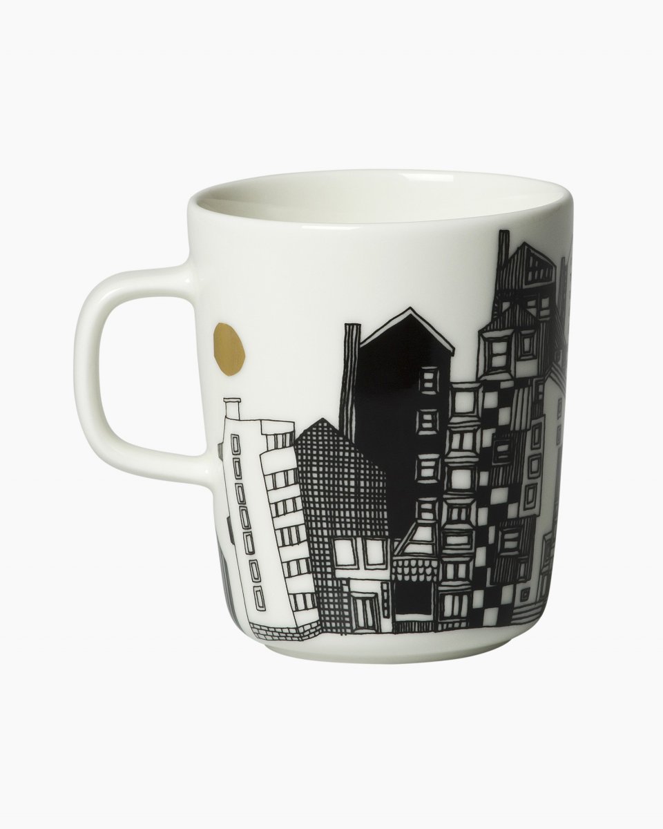 Marimekko Oiva 10 Years -mukissa on mustavalkoinen Siirtolapuutarha-kuosi, jota koristaa kultainen aurinko. Tilaa juhlamuki nyt!