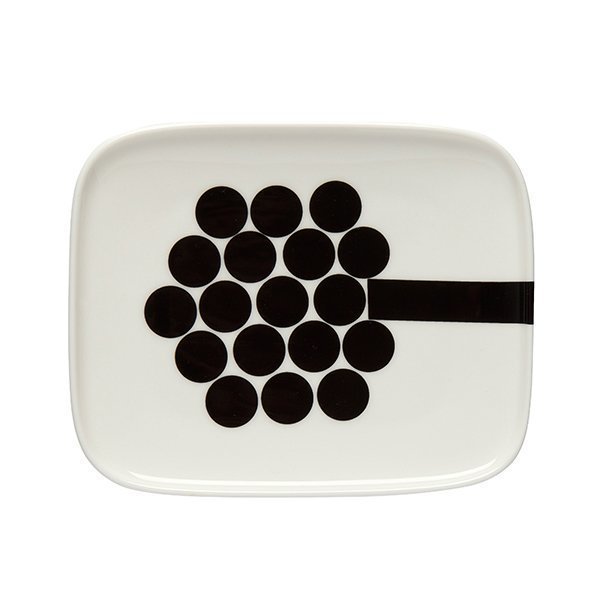 Marimekon Hortensie-lautasen graafinen kuosi kuvaa ristikon varassa kiipeilevää köynnöshortensiaa. Suunnittelija Carina Seth Andersson sai inspiraation moderniin kukkakuvioon kesämökkinsä seinällä kasvavasta hortensiasta, ja Sami Ruotsalainen sommitteli sen elementit Oiva-sarjansa astioihin. Keraamisen lautasen mitat ovat 15 cm x 12 cm.