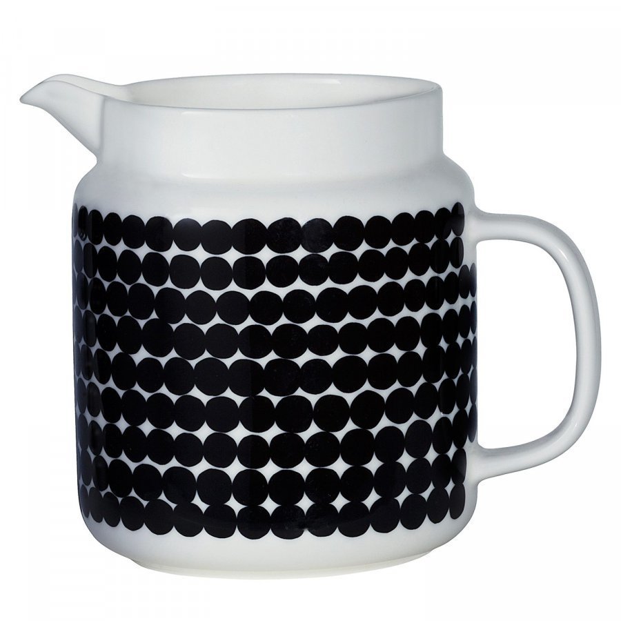 Oiva kannu, Marimekko. Klassinen kannu kauniilla mustalla ympyräkuvioinnilla. Kannu on valmistettu porsliinista ja sopii täydellisesti kahvin, maidon tai mehun tarjoiluun. Kesäjuhlille voit kätevästi tarjota siitä sangriaa tai muita kuplivia tai vilvoittavia juomia.