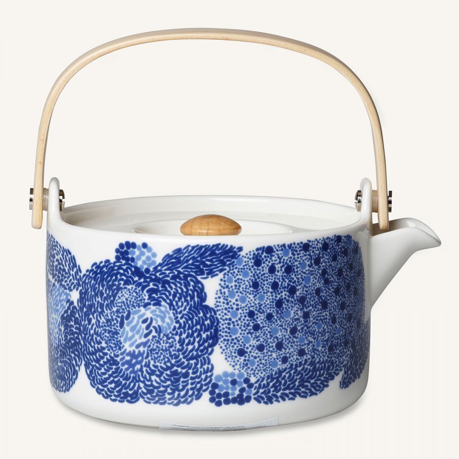 Oiva Mynsteri Kahvi- tai teekannu merkiltä Marimekko. Hurmaava sinisen sävyinen posliini on valmistettu kivitavarasta. Sarjaan kuuluu teekannu, muki, kahvikuppi sekä kulho. Kestävät konepesun ja mikroaaltouunin.