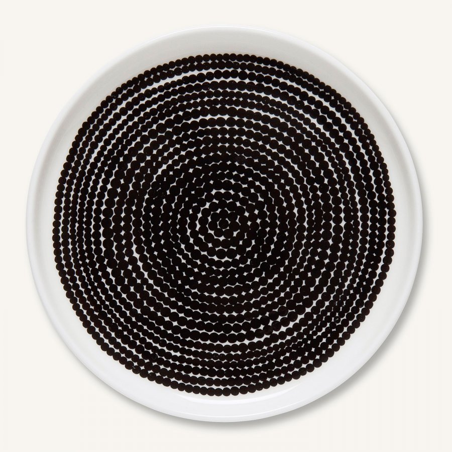Oiva Räsymatto lautanen merkiltä Marimekko. Asetti pilkullisena kuviolla mustavalkeana. Valmistettu kivitavarasta, joka kestää sekä mikroaaltouunin että astianpesukoneen.