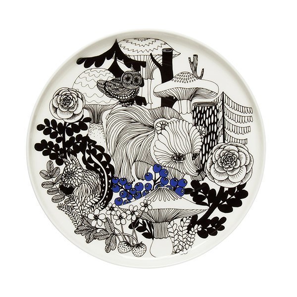 Marimekon Veljekset-lautasta somistaa viehättävä metsäaiheinen kuvio, jonka Maija Louekari suunnitteli Suomen itsenäisyyden 100-vuotisjuhlan kunniaksi. Inspiraation karhuja, ilveksiä, oravia, tikkoja ja pöllöjä kuvaavaan kuosiin Louekari sai suomalaisista kansantaruista. Keraaminen lautanen kuuluu Sami Ruotsalaisen suunnittelemaan Oiva-astiasarjaan, ja se kestää konepesua, pakastusta sekä kuumentamista uunissa ja mikroaaltouunissa.