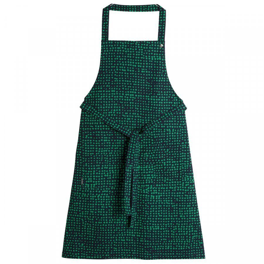 Marimekon Orkanen-esiliina saa luonteensa Carina Seth-Anderssonin suunnittelemasta Orkanen-kuosista, jota rytmittää kaunis täpläkuvio tummansinisen ja vihreän sävyissä. Tukevasta puuvillasta valmistetu esiliina on varustettu etutaskulla, säädettävällä kaulanauhalla ja taakse sidottavilla vyötärönauhoilla.