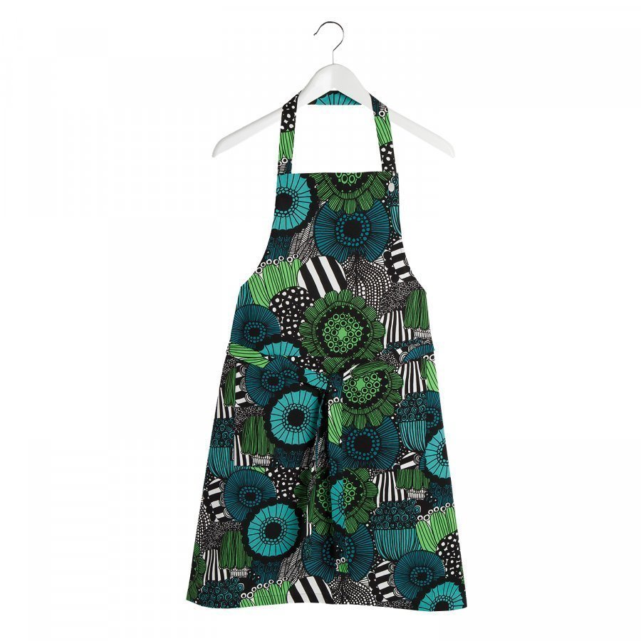 Pieni Siirtolapuutarhaesiliina Marimekolta. Tämä jännittävä ja ainutlaatuinen kuvio vie sinut takaisin luontoon ja sen vihreyteen. Jokaisen keittiössä viihtyvän must have- tuote. Esiliinassa on suuri tasku edessä, johon voit laittaa salaisten reseptien lisäksi kauhoja, vispilöitä ja keittokirjoja.