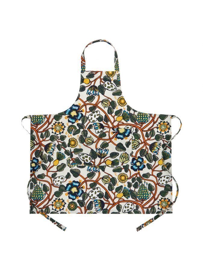 Laadukasta esiliinaa koristaa Erja Hirven suunnittelema ihanan värikylläinen kuosi. Esiliinassa on kolmella painonapilla säädettävä niskanauha sekä solmittavat vyötärönauhat. Edessä on tilava tasku.
