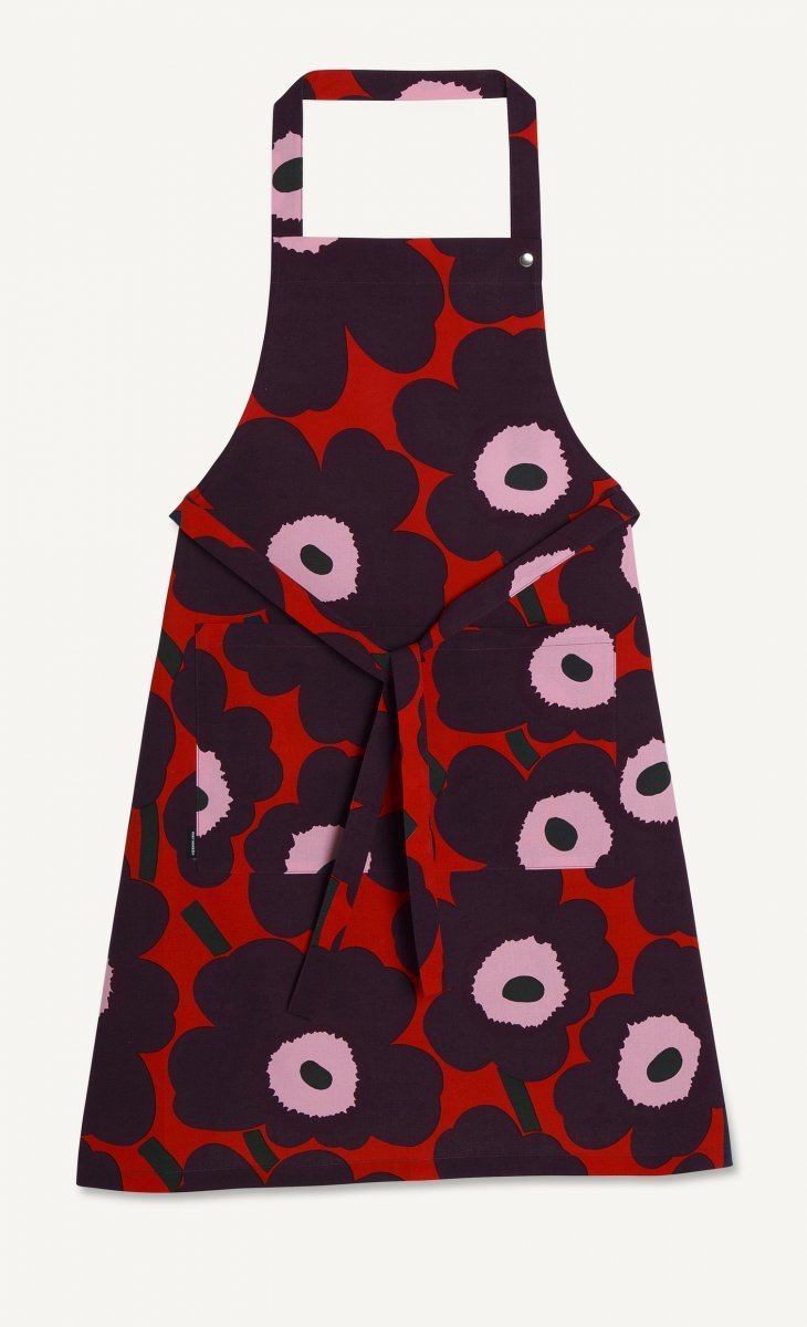 Marimekko Pieni Unikko -esiliinan klassikkokuosi punaisen, violetin ja v.punaisen sävyissä. Tilaa laatua!