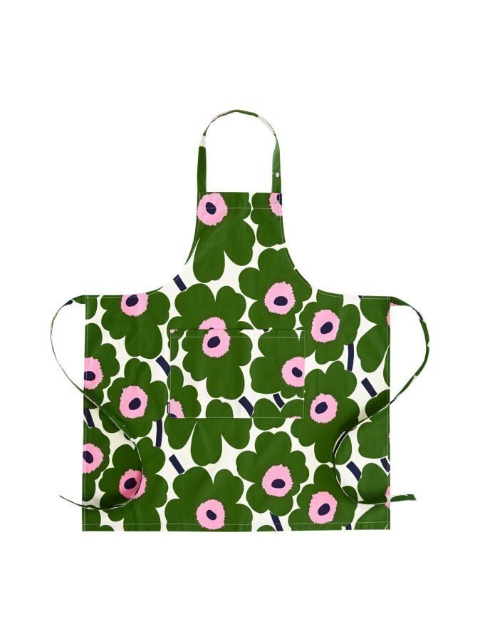 Esiliinassa on Pieni Unikko -kuosi. Edessä on etutasku. Esiliinassa kolmella painonapilla säädettävä niskanauha ja vyötäröllä solmittavat nauhat.