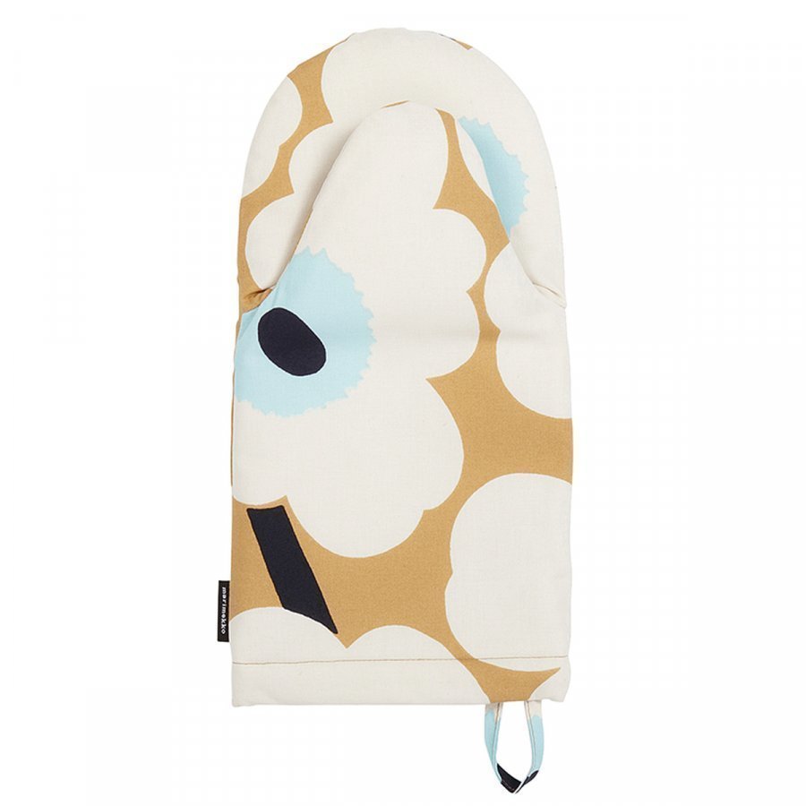 Marimekon Pieni Unikko -uunikinnasta elävöittää Maija Isolan vuonna 1964 suunnittelema ikoninen kukkakuosi beigen, luonnonvalkoisen ja vaaleansinisen lempeissä sävyissä. Topatussa uunikintaassa on kätevä ripustuslenkki, ja se sopii sekä oikea- että vasenkätisille ruoanlaittajille.