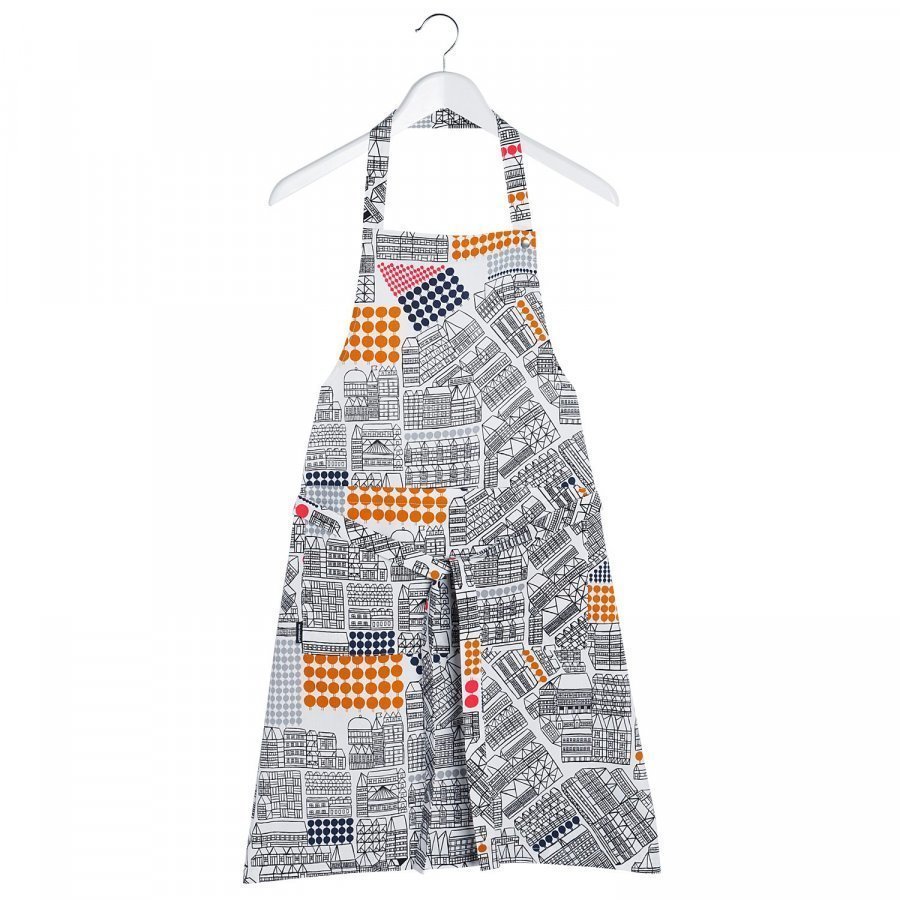 Puisto-osasto esiliina, Marimekko. Hyvännäköinen kuvioitu esiliina niin mestarikokille, leipojalle kuin ruoanlaittoharrastelijalle. Esiliinasta löytyy iso tasku vatsan kohdalta jonne voit kätevästi piilottaa kaikki salaiset reseptisi, vispisi tai keittokirjasi. Esiliina sidotaan kiinni koristeellisella nauhalla ympärillesi ja se pysyy hyvin paikoillaan.
