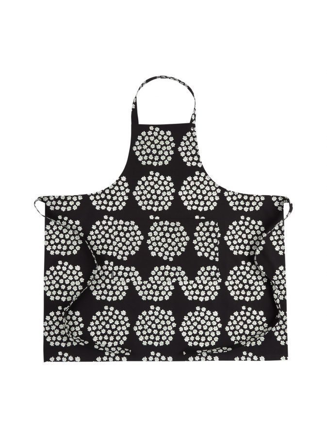 Esiliinassa on klassinen Puketti-kuosi. Edessä on avoin tasku. Niskanauhan pituutta voi säätää painonapein ja vyötäröllä on solmimisnauhat. Materiaali on 100 % puuvillaa. Konepesu 60°C.