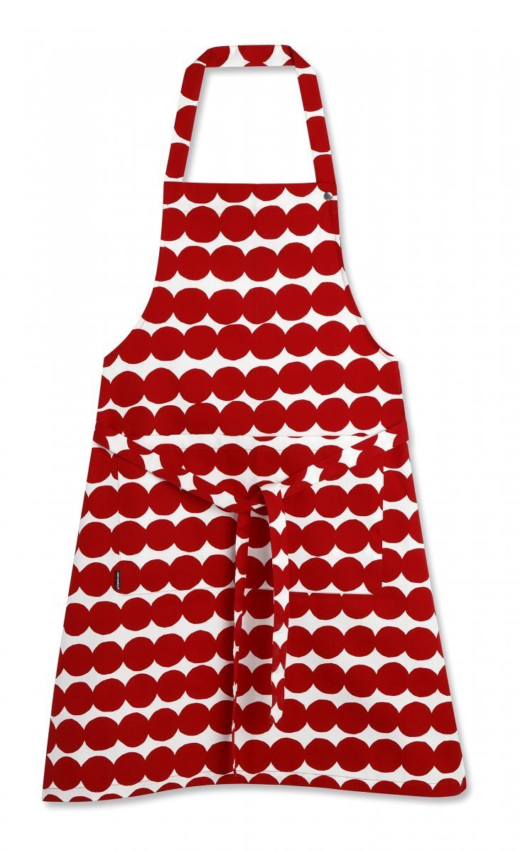 Marimekko Räsymatto -esiliinan kuosin design: Maija Louekari. Puna-valkoinen. Ostoksille!