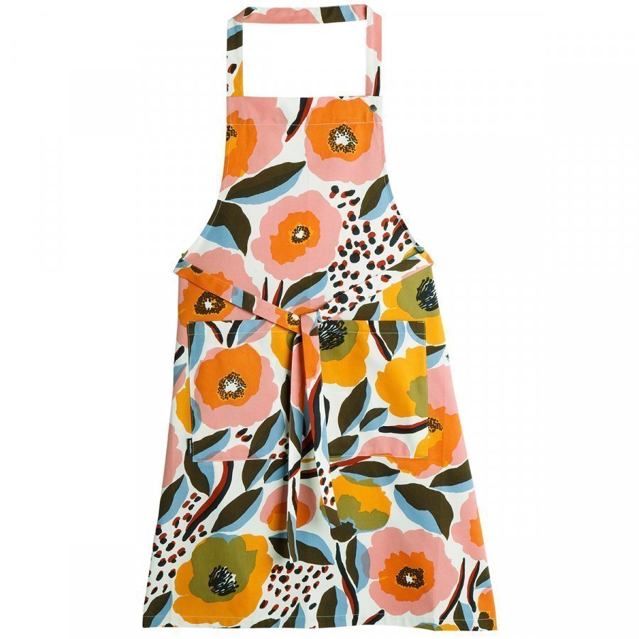 Marimekon Rosarium-esiliinan kuosissa kukkivat Aino-Maijan Metsolan suunnittelemat maalaukselliset, monisävyiset kesäkukat. Tukevasta puuvillasta valmistettu esiliina on varustettu etutaskulla, säädettävällä kaulanauhalla ja taakse sidottavilla vyötärönauhoilla.