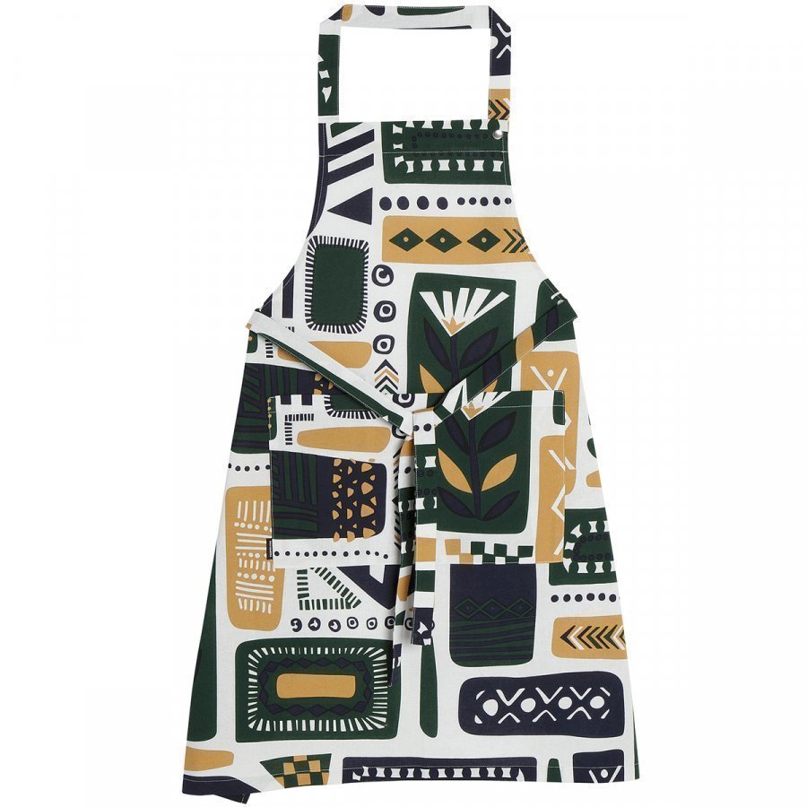 Marimekon Svaale-esiliinaa elävöittävät Sanna Annukan vuonna 2017 suunnittelemat folkloristiikasta inspiroituneet kuviot kauniin maanläheisissä sävyissä. Tukevasta puuvillasta valmistettu esiliina on varustettu etutaskulla, säädettävällä kaulanauhalla ja taakse sidottavilla vyötärönauhoilla. Kangas on painettu Helsingissä.