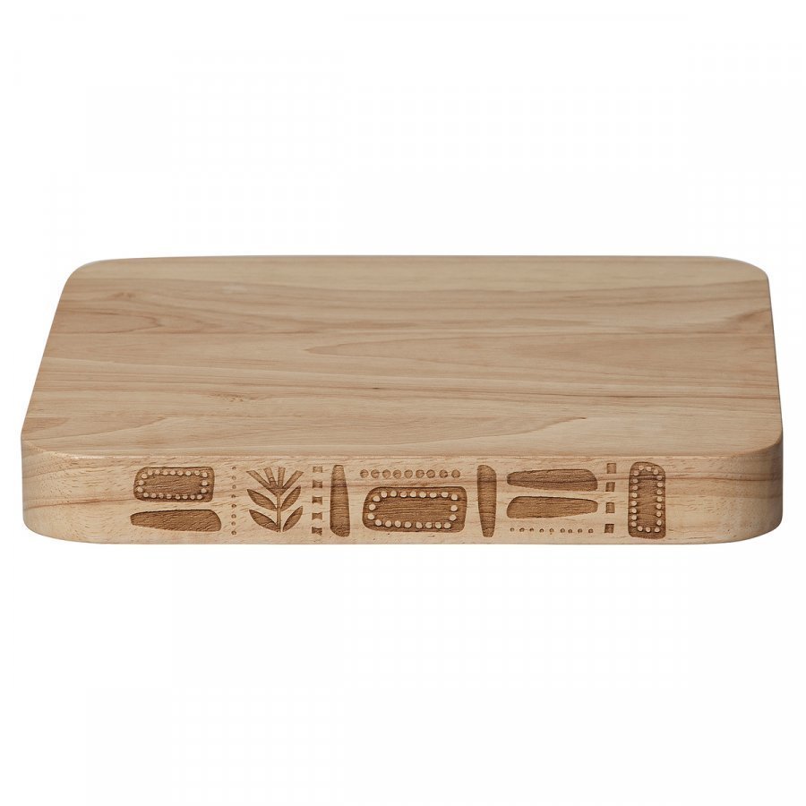 Marimekon Svaale-leikkuulautaa elävöittävät Sanna Annukan vuonna 2017 suunnittelemat folkloristiikasta inspiroituneet kuviot. Kulmista pyöristetty leikkuulauta on valmistettu kauniista ja lujasta kumipuusta.