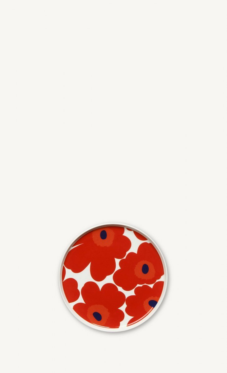 Punainen Unikko-klassikkokuosi elävöittää Oiva-keramiikkalautasta, joka on valmistettu valkoisesta kivitavarasta. Se kestää konepesun, mikrouunin ja pakastuksen.