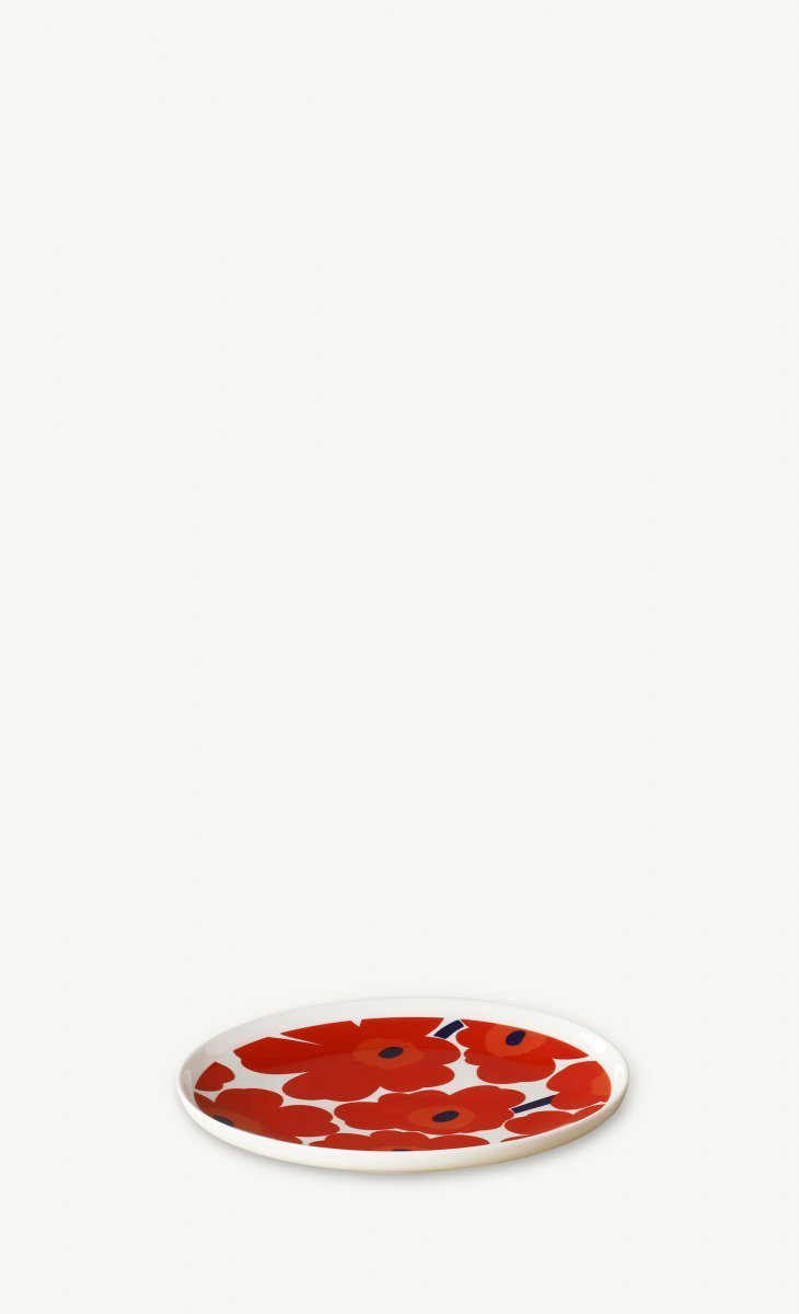 Punainen Unikko-klassikkokuosi elävöittää Oiva-keramiikkalautasta, joka on valmistettu valkoisesta kivitavarasta. Se kestää konepesun, mikrouunin ja pakastuksen.