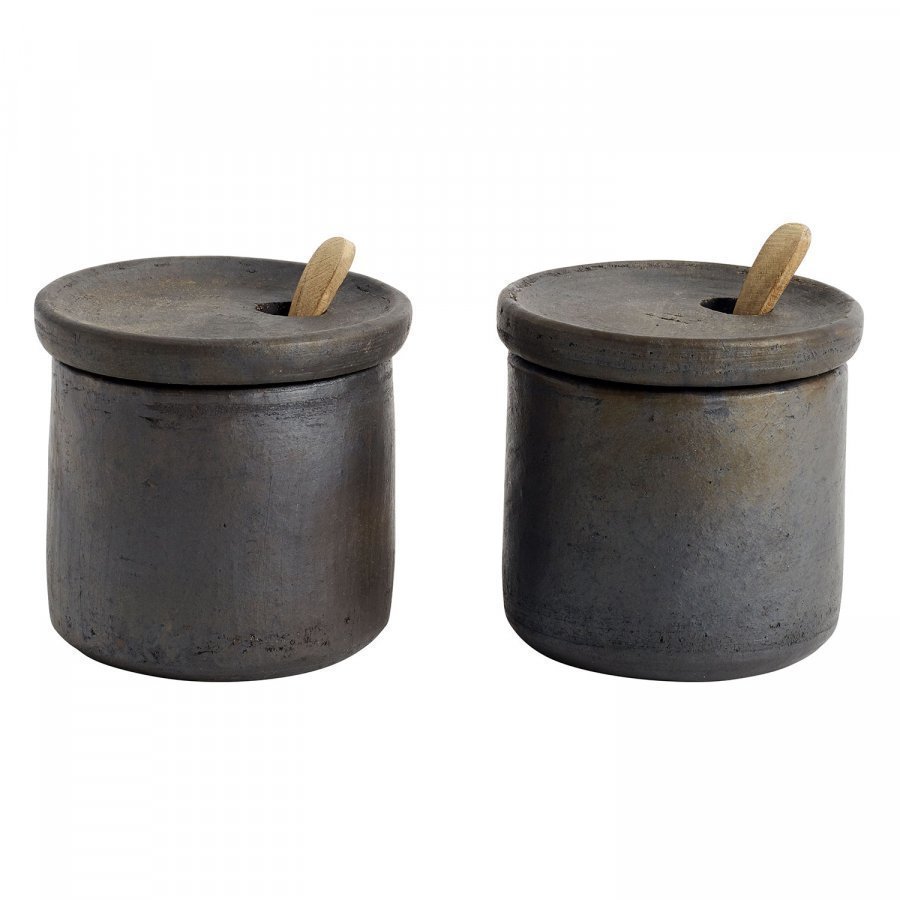 A beautiful Salt & Pepper set from Muubs, in fine brown terracotta. Spoons not included.