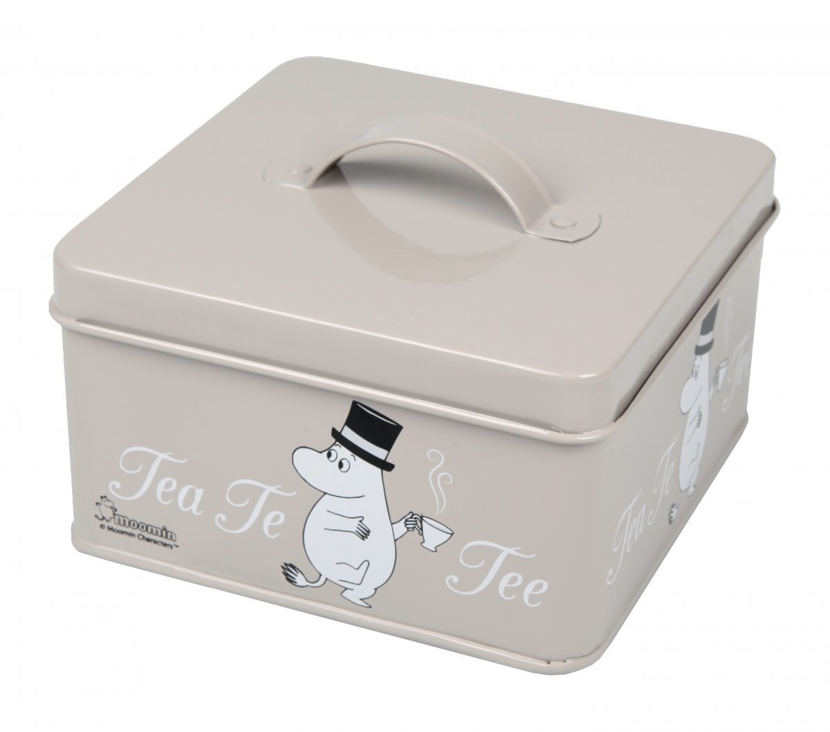 Muumipapan tiiviskansinen teepurkki, jonka sisällä on neljä lokeroa teepusseille. Purkki on kooltaan 9,5 x 14 x 14 cm.