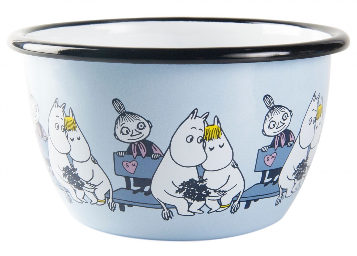 Suloista muumiaiheista emalikulhoa koristaa Muumipeikko, Niiskuneiti ja Mymmeli. 60 cl vetoinen kulho sopii esimerkiksi murojen ja puuron tarjoiluun.