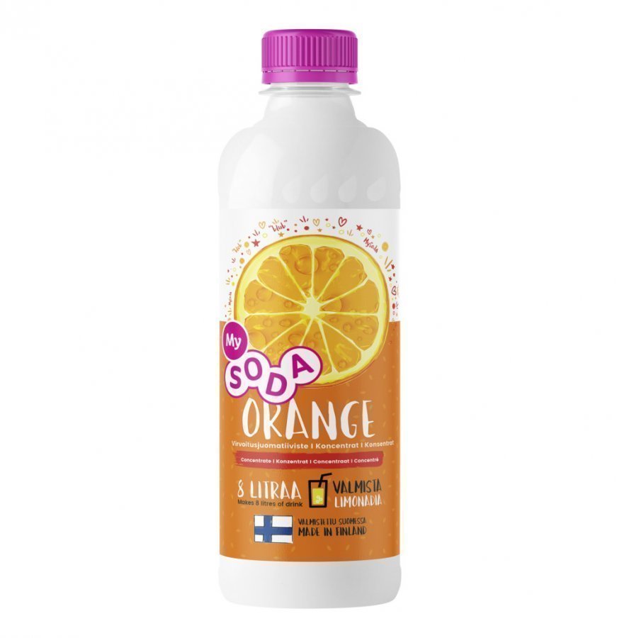 MySoda Appelsiini-virvoitusjuomauute. MySoda-virvoitusjuomat voi valmistaa veden hiilihapottamisen jälkeen suoraan lasiin: lasilliseen kuplavettä (2,5 dl) laitetaan ruokalusikallinen tiivistettä. Ei se sen kummempaa ole. Yhdellä tiivistepullolla saa tehtyä 8 litraa virvoitusjuomaa. Kaikki MySoda-tiivisteet valmistetaan Kuopiossa. MySoda Orange on sokeriton ja sisältää makeutusaineita. Sisältää fenyylialaniinin lähteen. Pakkauskoko 500 ml. Ainesosat: Vesi, happamuudensäätöaine (E330), stabiloin. . .