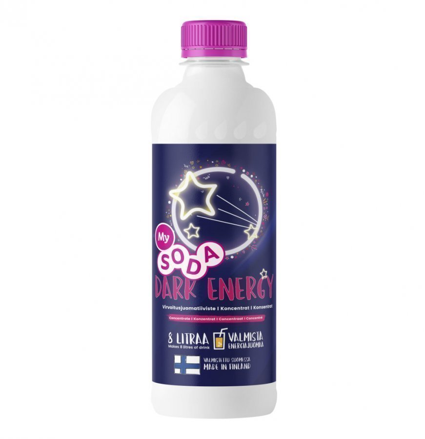 MySoda Dark Energy-virvoitusjuomauute. MySoda-virvoitusjuomat voi valmistaa veden hiilihapottamisen jälkeen suoraan lasiin: lasilliseen kuplavettä (2,5 dl) laitetaan ruokalusikallinen tiivistettä. Ei se sen kummempaa ole. Yhdellä tiivistepullolla saa tehtyä 8 litraa virvoitusjuomaa. Kaikki MySoda-tiivisteet valmistetaan Kuopiossa. MySoda Dark Energy on sokeriton ja sisältää makeutusaineita. Sisältää fenyylialaniinin lähteen. Juoma sisältää makeutusaineita, kofeiinia, tauriinia ja B-vitamiinej. . .