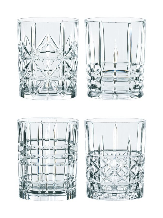 Pakkauksessa on neljä tyylikästä Hihgland-lasia, joissa jokaisessa on erilainen ja näyttävä, valoa taittava kohopinta. Highland-lasi soveltuu erityisesti viskille ja erilaisille cocktail-juomille. Tilavuus on 295 ml, korkeus 10,2 cm ja halkaisija on 8,2 cm.Materiaali on kristallia.95906-0