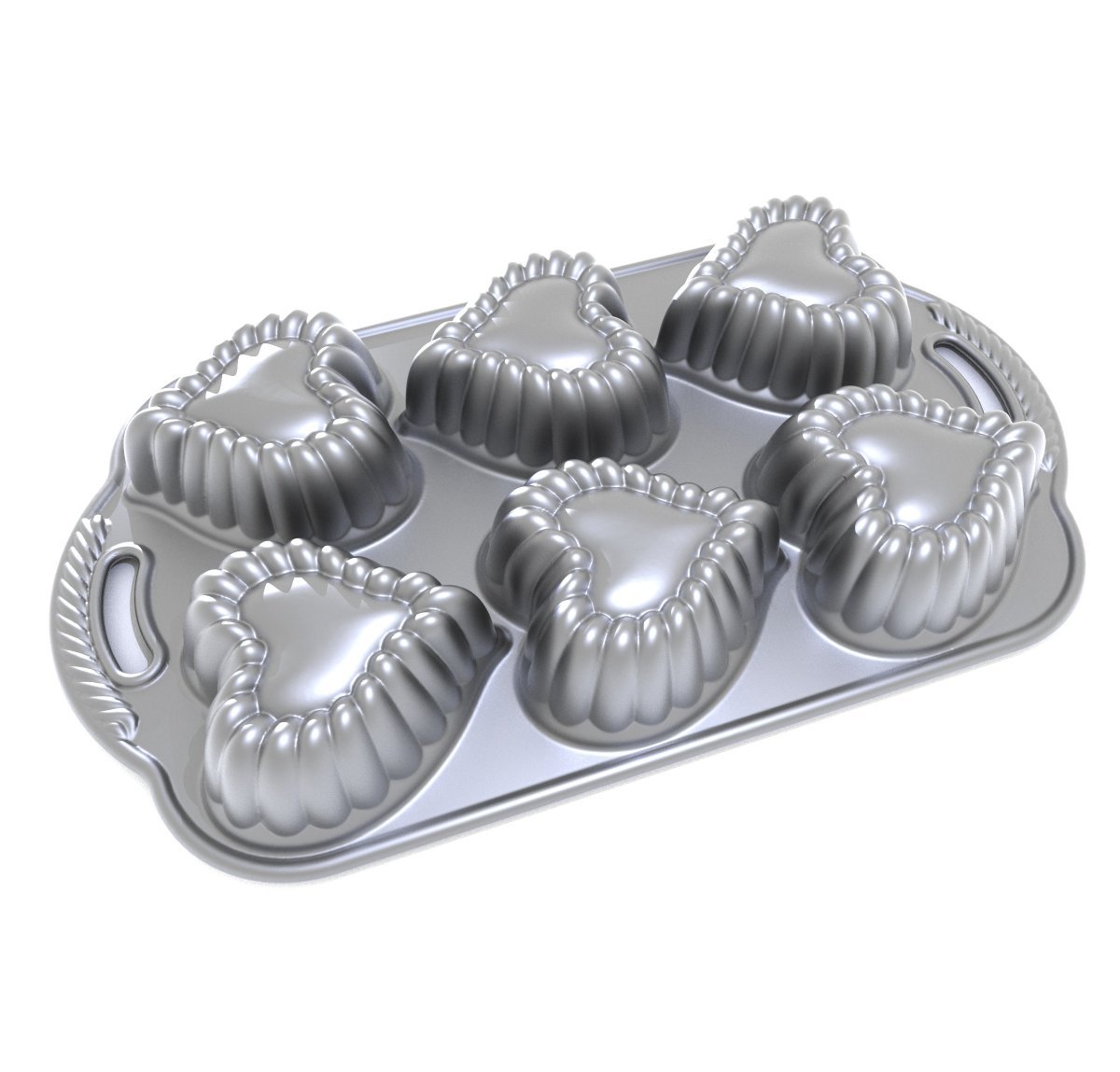 Alumiinista valmistettu kakkuvuoka non-stick pinnoitteella, jonka avulla kakku irtoaa vuosta helposti. Vuossa on kuusi sydämenmuotoista kohtaa, joilla valmistaa herkullisia ja kauniita pieniä kakkuja. Kiitos materiaalin, joka johtaa lämpöä nopeasti ja tehokkaasti, voit luottaa, että tulos on aina hyvä kakkuja leipoessa. Parhaan tuloksen saavuttamiseksi, odota kakun paistuttua kymmennen minuuttia ennen kuin irrotat sen vuosta. Vuokaa voi käyttää myös kaasu- sekä sähköliedellä. Ei kestä konepesua.
