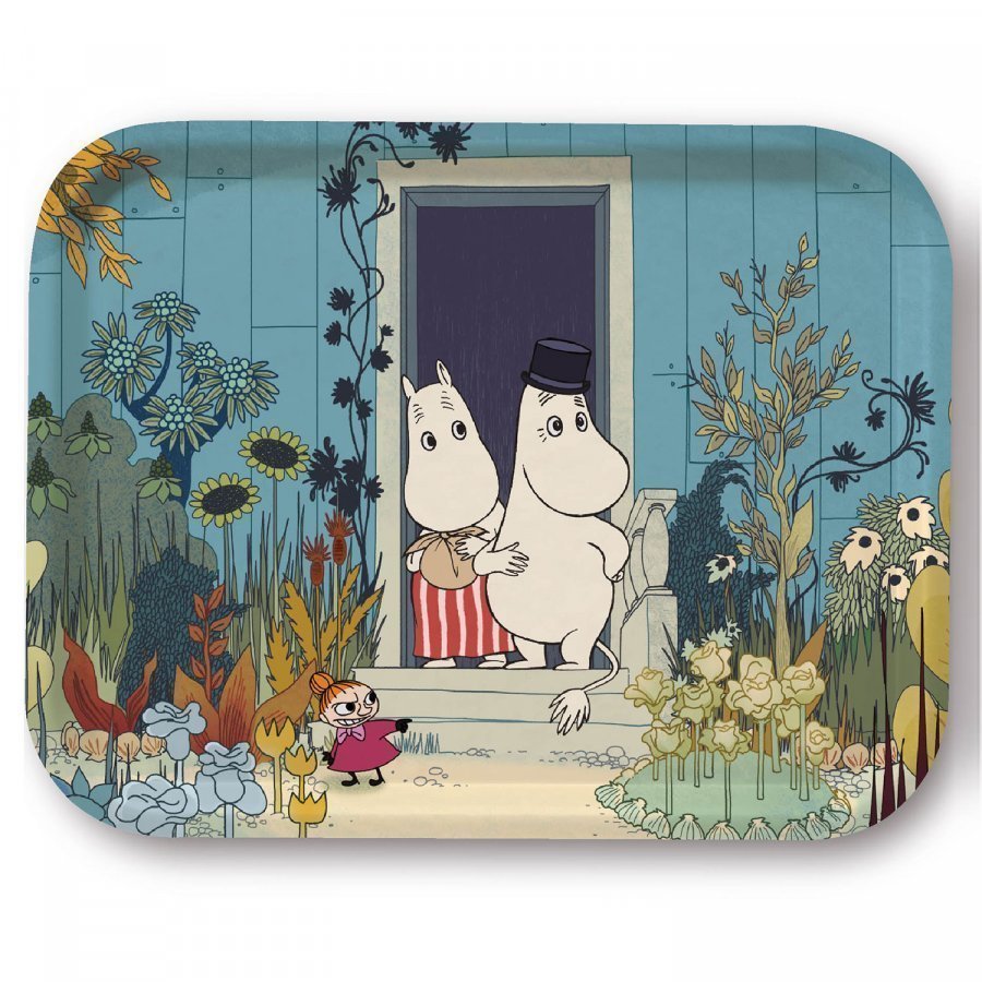 Opto Designin Moomin Doorstep -kokoelmasta löytyy erilaisia tavaroita kotiisi, kuten tarjottimia, päällisiä ja leikkuulautoja, joissa on kaunis kuvio.