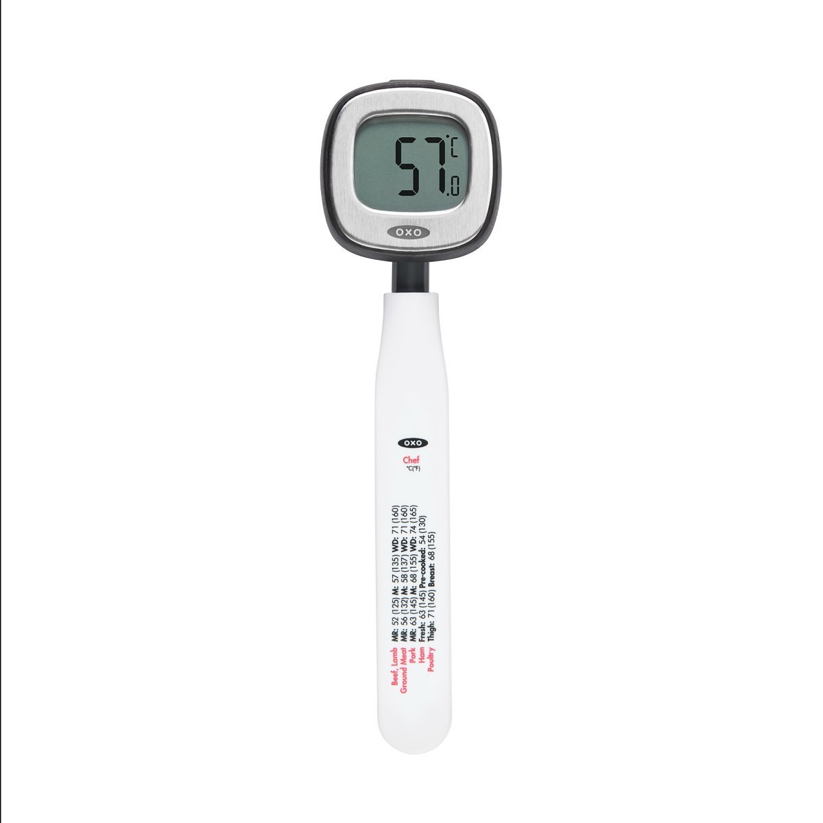 Kätevä lämpömittari näyttää tarkan lämpötilan nopeasti ja selvästi (°F ja °C). Lämpömittarin tikun voi helposti asettaa lihaan ja lämpömittarin pään voi tarvittaessa taittaa. Tikun mukana tulee kotelo jossa näkyy suositellut paistolämpötilat.