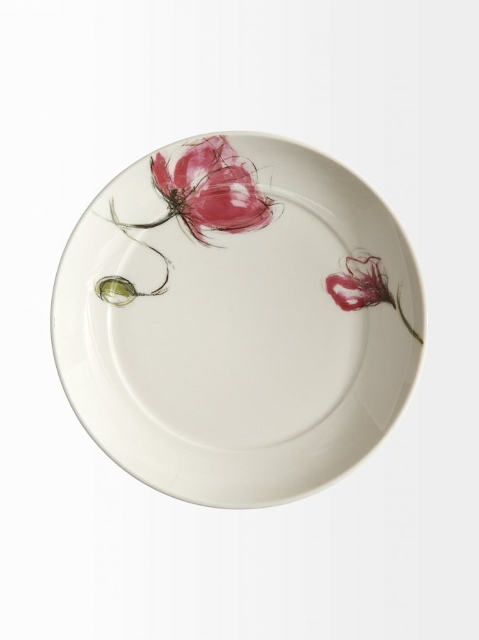 Pentikin uutuusastiastoon kuuluvassa lautasessa on vesivärimäinen kukkakuvio. Keramiikka-astia kestää konepesun, uunin, mikroaaltouunin ja pakastamisen. Lautasen halkaisia on 21 cm.