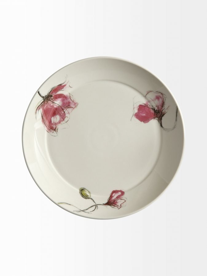 Pentikin uutuusastiastoon kuuluvassa lautasessa on vesivärimäinen kukkakuvio. Keramiikka-astia kestää konepesun, uunin, mikroaaltouunin ja pakastamisen.