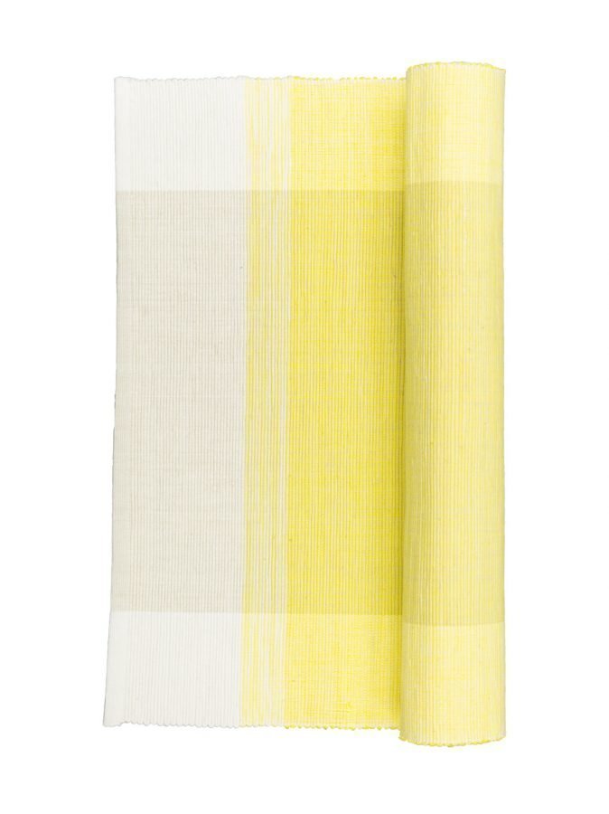 Kata pöytä vuodenajan mukaan. Kohopintaisessa kaitaliinassa on keväinen sävy.