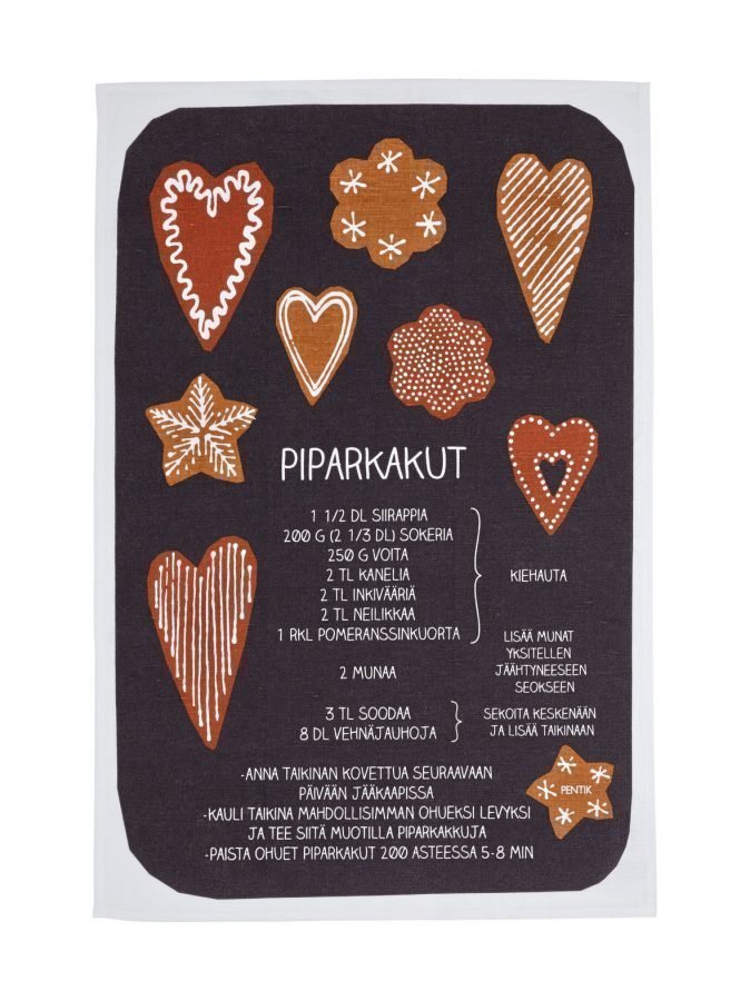 Sympaattisessa keittiöliinassa on piparkakkutaikinan ohje. Eikun leipomaan pipareita!Materiaali on 50 % pellavaa ja 50 % puuvillaa. Konepesu.1PEL7350P21