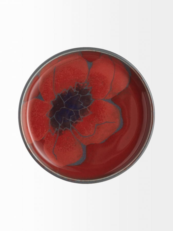 Pentikin studiokeramiikkasarjaa edustava Punakukka-lautanen hehkuu kauniin punaisessa sävyssä. Materiaali on lasittamatonta keramiikkaa. Käsinpesu.