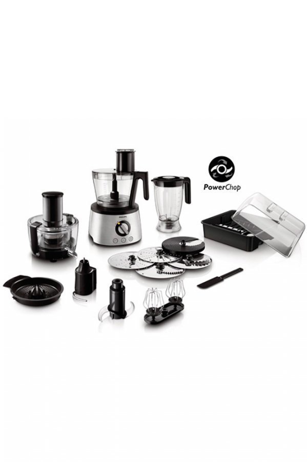 Monipuolisia ruokia pienellä vaivalla Voit tehdä leipää, kakkuja, juomia ja paljon muuta Philipsin Avance-malliston monitoimikone on monipuolinen ratkaisu keittiösi tarpeisiin. Sen uuden metallisen taikinakoukun, tehokkaan 1000 watin moottorin ja taikinalle tarkoitetun yhden kosketuksen automaattipainikkeiden ansiosta leivän leipominen on helpompaa kuin koskaan. Leivän ja kakkujen leipominen on nyt todella helppoa • Metallinen kaksoisvispilä kerman ja valkuaisten vatkaamiseen • Metallisella taikinakoukulla täydellistä leipätaikinaa • Teräyksikkö kakkutaikinan sekoittamiseen ja vatkaamiseen Luotettavat tehon ja nopeuden asetukset • PowerChop-tekniikka varmistaa huippuluokan suorituskyvyn • Yhden kosketuksen automaattipainikkeet leipätaikinalle, vatkaukseen ja jäälle Helppo käsitellä ja vaivaton puhdistaa • 18 cm:n XXL-levyt pilkkovat kaikki ruoka-aineet nopeasti • Konepestävät lisäosat • 3,4 litran kulho ja 2,2 litran sekoituskulho perhekokoisille annoksille Tarkoin valitut lisävarusteet takaavat parhaan tuloksen • Mukana neljä lisäterää ruostumattomasta teräksestä • Sitruspuserrin ja kuuden lasin mehulinko, jossa metalliverkko
