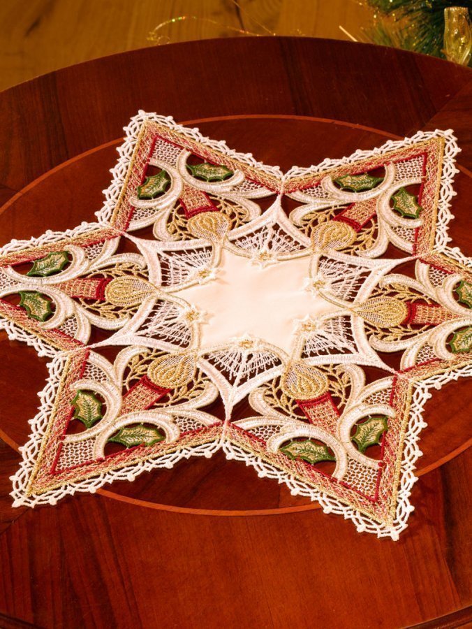 Pikkuliina ’Jouluntähti’. Laadukasta Plauenin pitsiä. Värikäs ja jouluinen yksityiskohta kotiin. Materiaali polyesteriä.