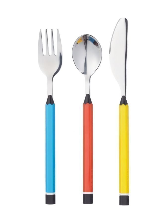 Lasten aterinsetti sisältää haarukan, veitsen ja lusikan, joiden varsissa on hauska kynänmallinen muotoilu. Materiaali on ruostumatonta terästä ja ABS-muovia.