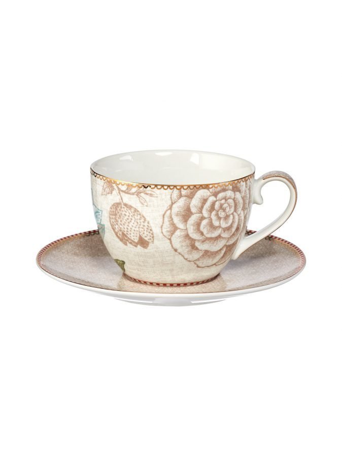 Kuppiparin asetissa on yksityiskohtaista, graafista kukkakuviointia. Cappuccinokuppia koristavat suurikokoiset kukat. Kupissa ja asetissa on koristekullatut reunat.