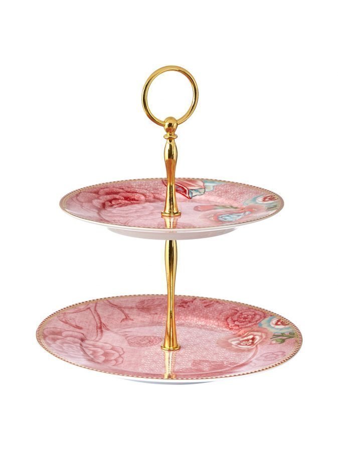 Värikkäästi kukkakuvioidussa kaksikerrosvadissa on kullatut reunat sekä kullanväriset metalliosat. Kerrosten halkaisijat ovat 17 ja 21 cm.
