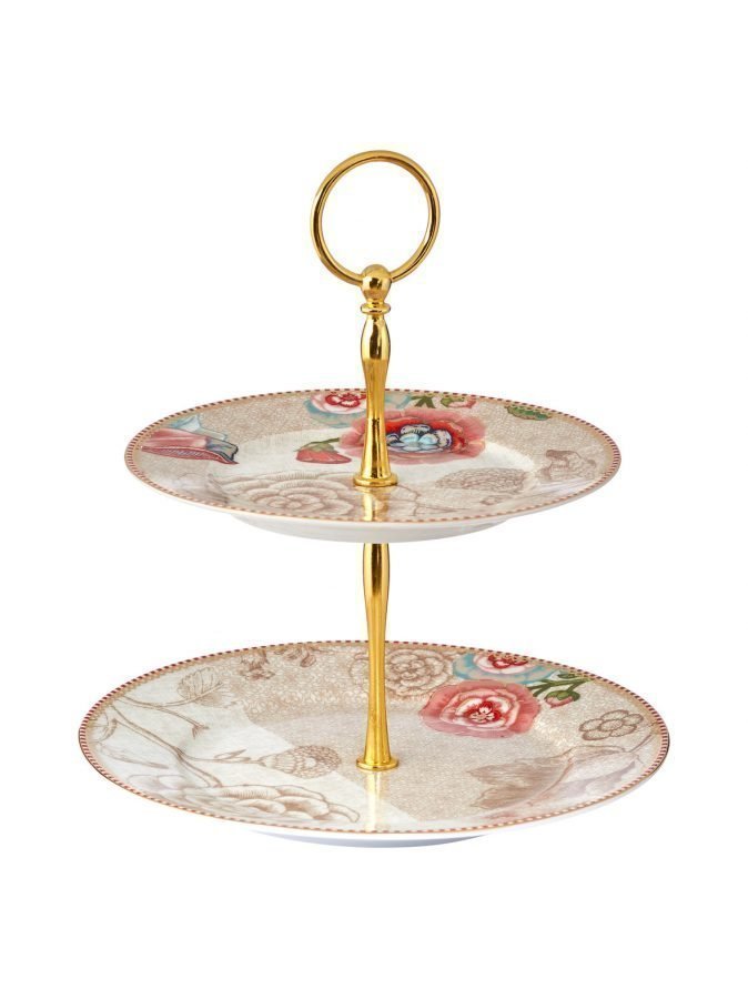 Kukkakuvioidussa kaksikerrosvadissa on kauniisti kullatut reunat sekä kullanväriset metalliosat. Kerrosten halkaisijat ovat 17 ja 21 cm.